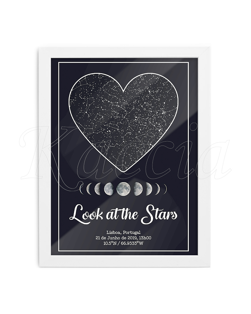 O Mapa das Estrelas retrata o alinhamento das estrelas e das constelações da tua data especial. Um quadro com a recriação exacta do céu que estava num determinado dia, hora e local à tua escolha. Não haverá qualquer outra pessoa com um quadro igual e um presente tão especial como este.